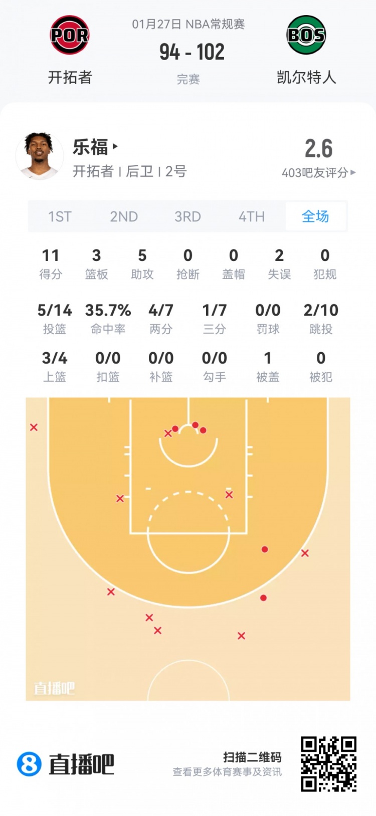 开拓者落选秀凯莱布·乐福 登场25.7分钟