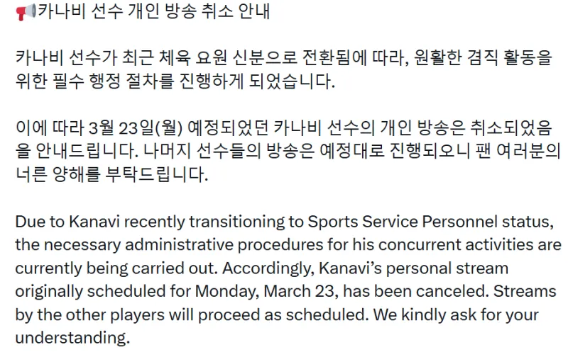 特此通知,原定于3月23日进行的Kanavi选手个人直播已取消。其他选手的直播将按原计划正常进行,恳请各位粉丝予以谅解。