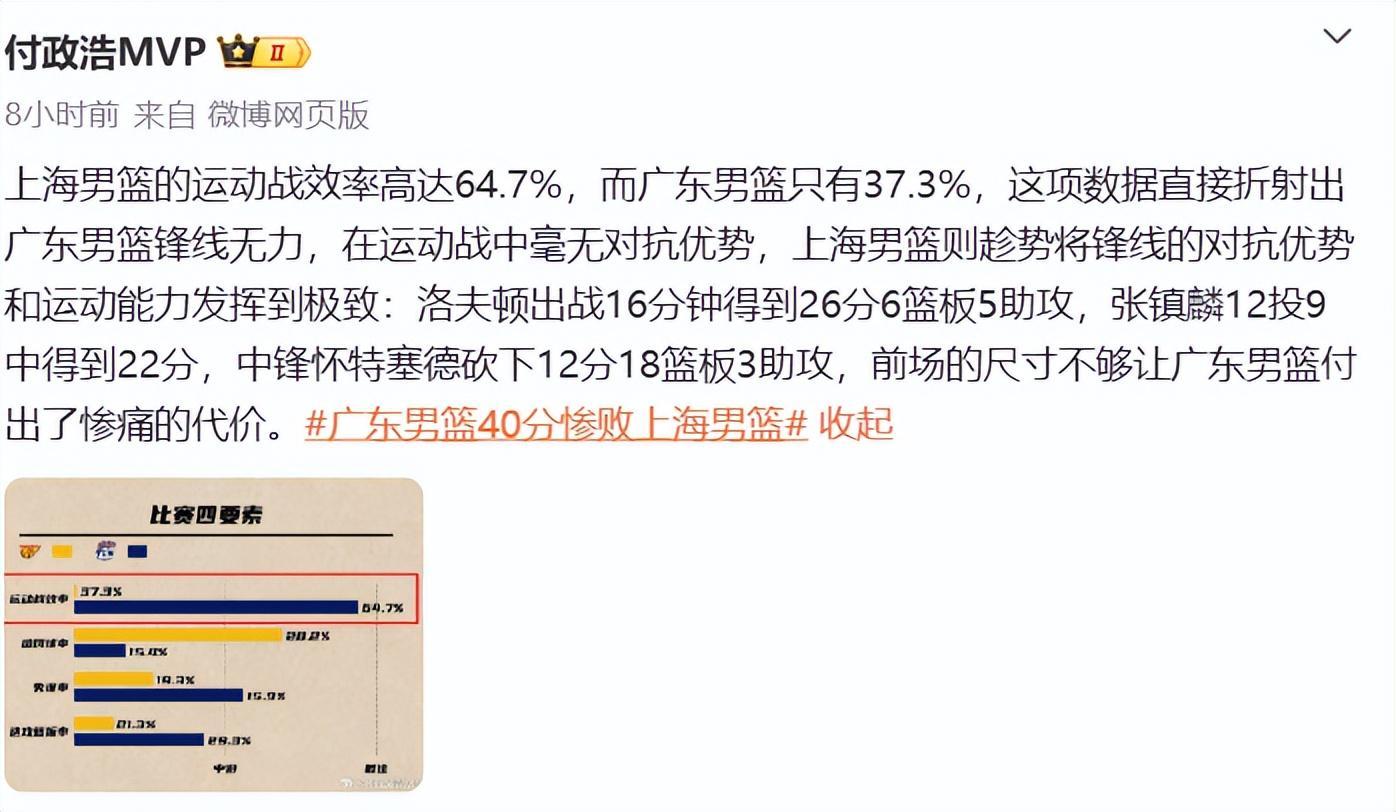 媒体人付政浩赛后晒出了一组数据,并且指出了广东队现阶段存在的1个致命隐患:上海男篮的运动战效率高达64.7%,而广东男篮只有37.3%,这项数据直接折射出广东男篮锋线无力,在运动战中毫无对抗优势,上海男篮则趁势将锋线的对抗优势和运动能力发挥到极致:洛夫顿出战16分钟得到26分6篮板5助攻,张镇麟12投9中得到22分,中锋怀特塞德砍下12分18篮板3助攻,前场的尺寸不够让广东男篮付出了惨痛的代价。