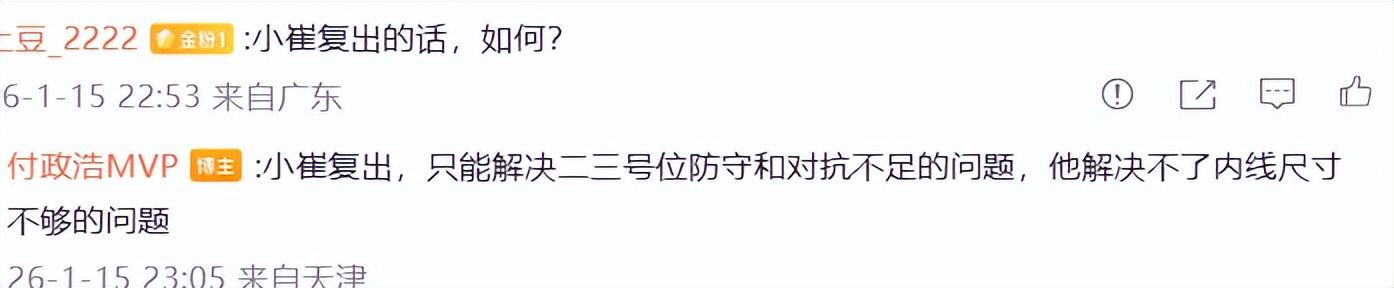 评论区有球迷问如果小崔复出的话,会怎么样?付政浩给出回复:小崔复出,只能解决二三号位防守和对抗不足的问题,他解决不了内线尺寸不够的问题。